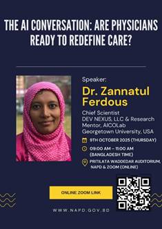 Dr Zannatul Ferdous, CEO of Dev Nexus Bangladesh is delivering a presentation titled as “ The AI Conversation: Are Physicians Ready for to Redefine Care?” for the Health Cadre Foundation Course in the National Academy for Planning and Development (NAPD) Dhaka on 9th October 2025